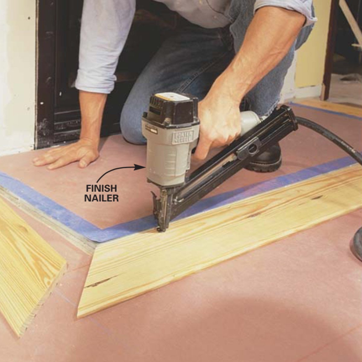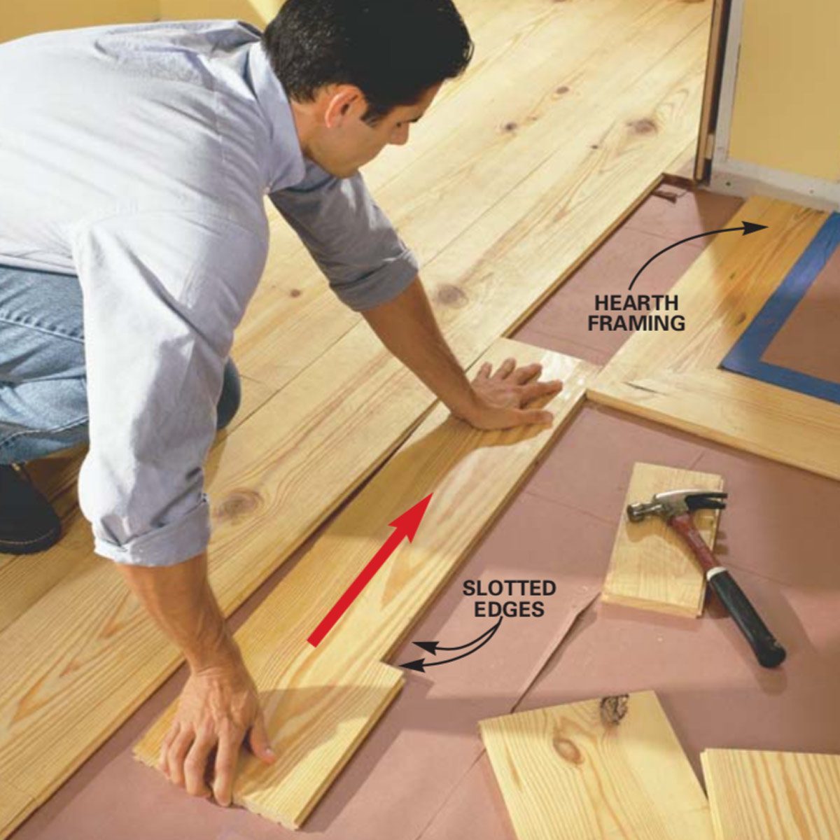 Later you’ll nail each board end into the joist with the decorative cut nails. Be sure to stagger butt joints from row to row so they don’t line up across the floor. Cut the boards to length with a circular saw but keep in mind that perfect cuts aren’t necessary; the ends at walls will be covered by the baseboard and it’s OK if the butt joints show small gaps. If you want to speed up the job, rent a sliding miter saw, especially for the angle cuts around the hearth.