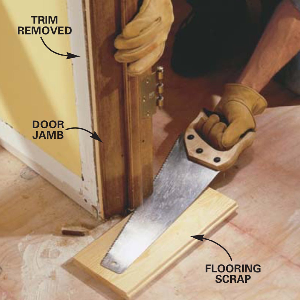 Cut out and replace any damaged subfloor. Also look for high spots, especially at seams. If a 4-ft. straightedge shows a 1/8-in. or bigger rise, belt-sand it off with a coarse grit. Use the nail lines to find the location of the floor framing (joists) and mark the walls for reference. Undercut any jambs to allow the new flooring to slide underneath. Undercut the door jambs (and the trim if it’s staying on) with a handsaw. Use a piece of scrap flooring as a height guide; this allows the new flooring to slide underneath. Vacuum the whole floor thoroughly.