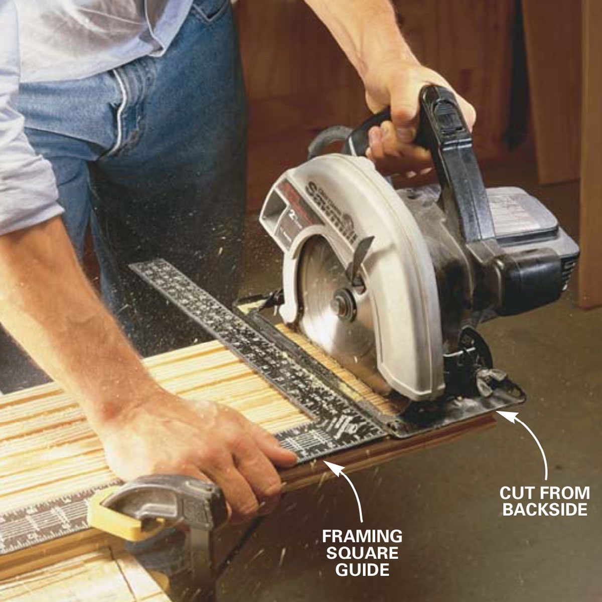 Cut boards to length with a circular saw. Clamp on a guide to ensure square cuts and cut from the back side of the board (to minimize splintering the good side). If you use a sliding miter saw, cut with the good side up.