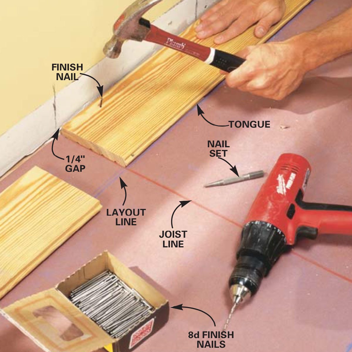 How to install tongue and groove flooring: Hand nail the first board in place