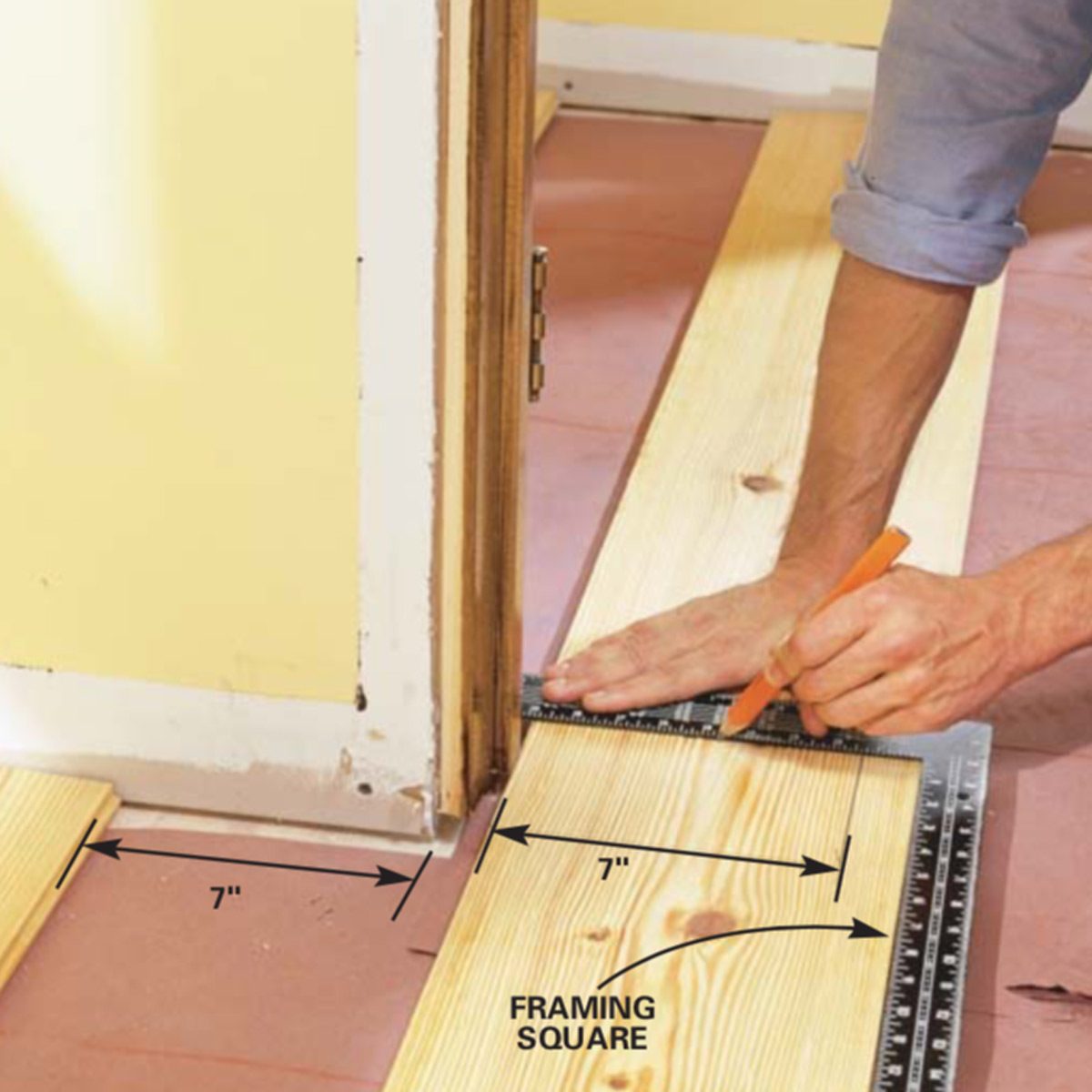 Hold the board in place at doorways and corners and mark for notching with a straightedge. The board only needs to fit within 1/4 in. of the wall and slide under the door jamb.
