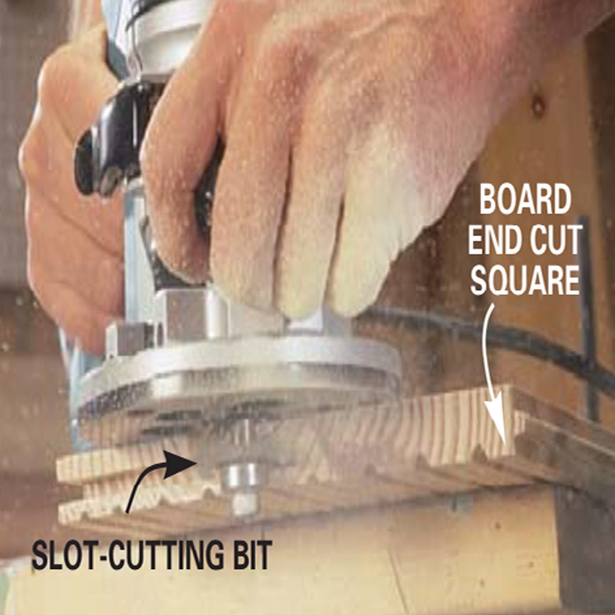 Cut the next board to length and groove the end with the slotting cutter.