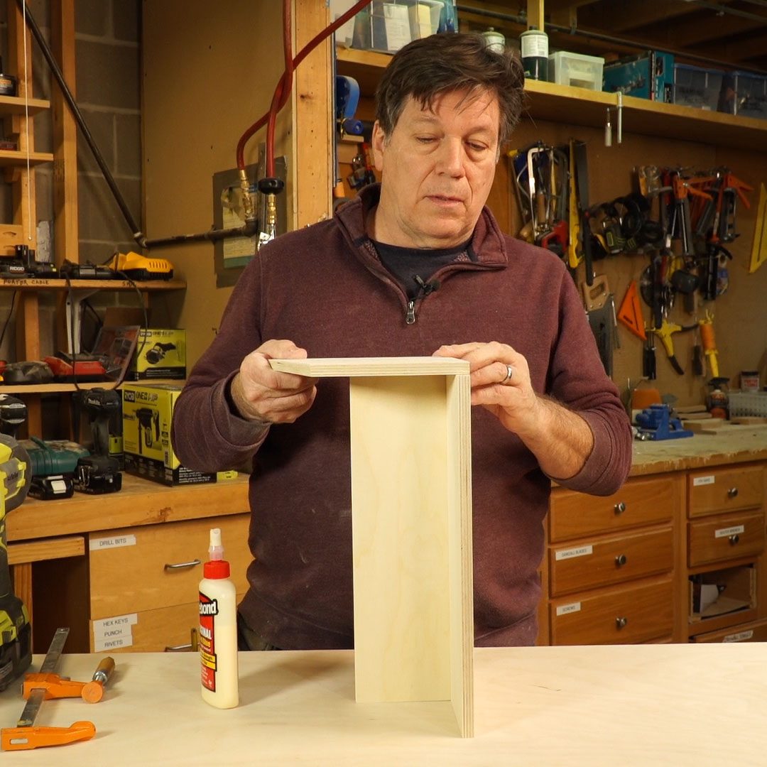 - Apply wood glue to the top and bottom edges of the right side, as well as the edges on the right end of both the back and the shelf.