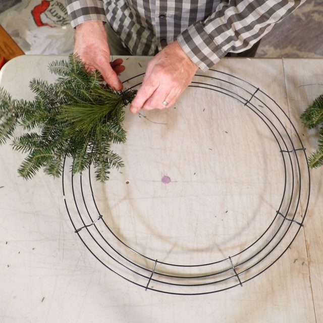 - Place your first bundle on top of the wreath frame so it follows the curve of the frame.