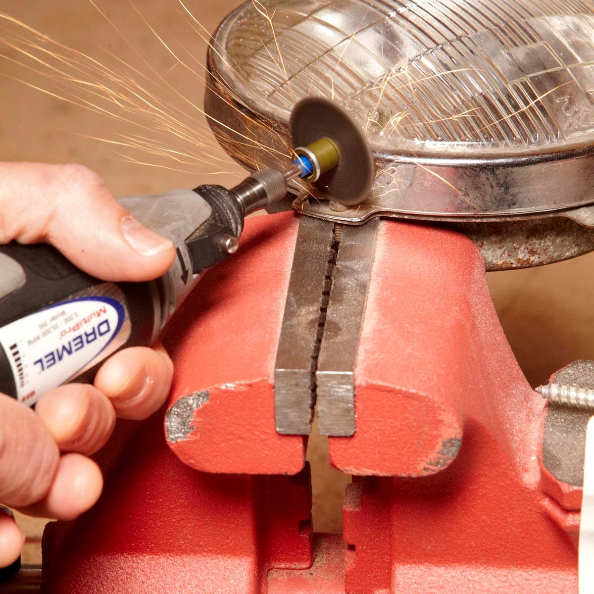 Slice a deep groove into the screw head with a cutting wheel and rotary tool. Make it wide enough to accommodate your largest flat-blade screwdriver. If you’ve stripped out the head, cut a new slot with a straight-groove rotary tool (photo 3). Then crank it out with a flat-blade screwdriver.