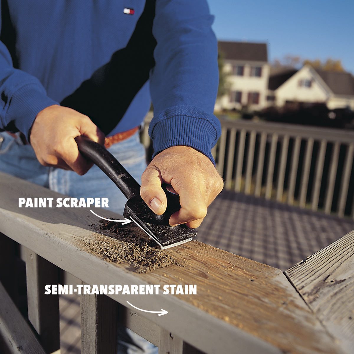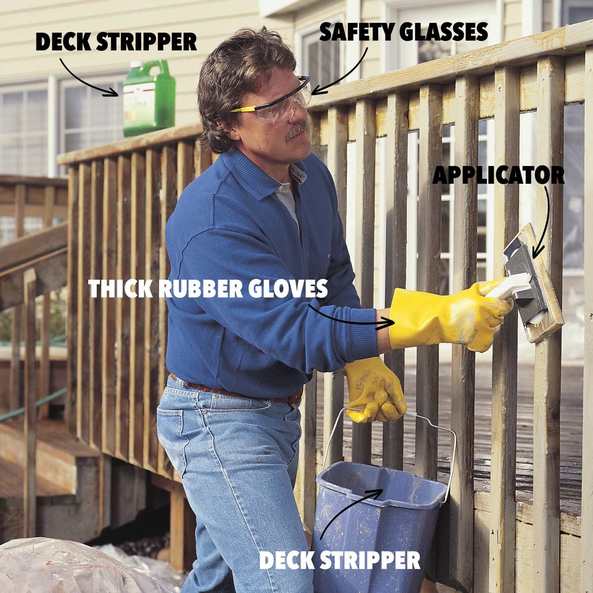 Both strippers and cleaners evaporate rapidly and become ineffective on hot, dry days. A cool, overcast day extends the working time of these solutions. Besides, you’ll want to make this messy job as comfortable as you can. This is hard work, so expect to sweat. You can work on the deck in sections (stripping railing sections) over several days if you don’t have an eight-hour block of time to do the whole deck.