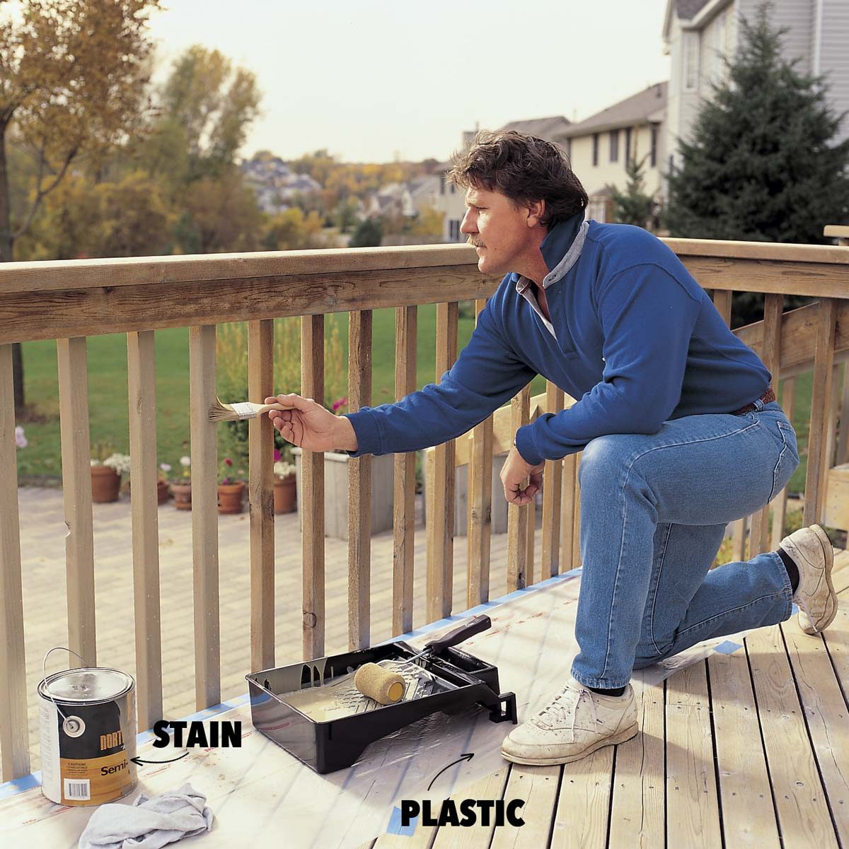 Brush your stain onto the railings. Cover your deck boards with tape and plastic to catch the drips. We recommend a semitransparent oil stain. Solid color stains have heavy pigment that’ll be tough to renew the next time you refinish the deck.