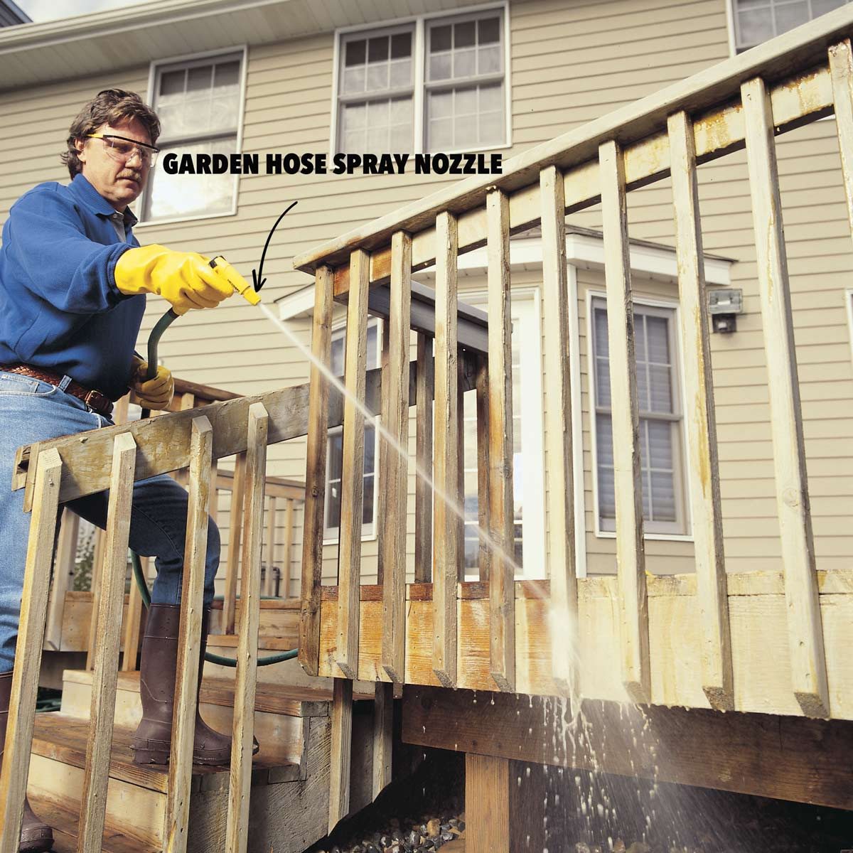 Rinse the old finish away with a brisk stream of water from your garden hose. You may have to reapply stripper if some finish is left on the wood. You pressure wash a deck at 1,000 psi, but be warned that too much water pressure could ruin the soft fibers of the wood. We had excellent results with a spray nozzle and regular water pressure.