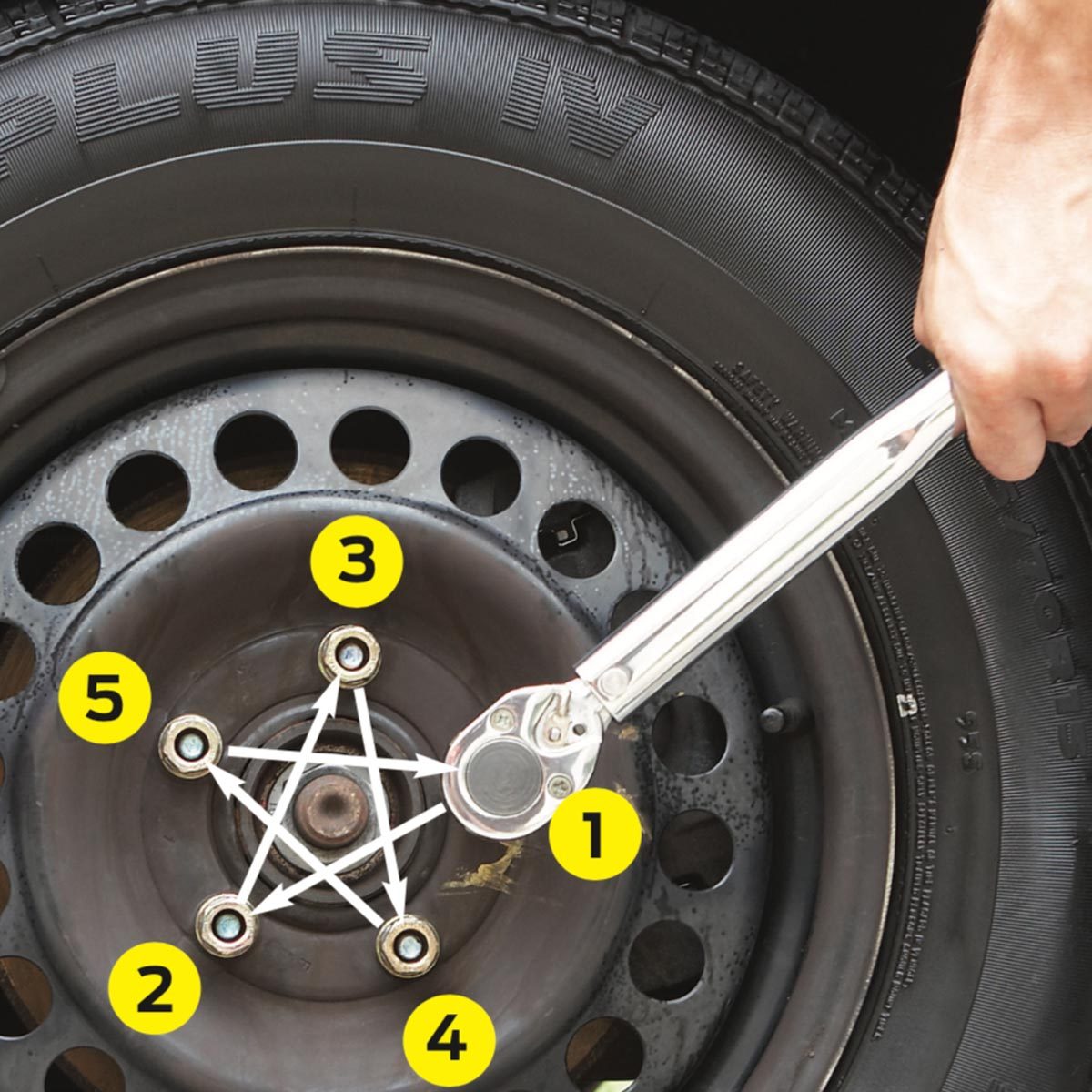 Reset the wrench and tighten each nut to full torque. Move the socket from one nut to the next in a star-shaped pattern, tightening each as you go.