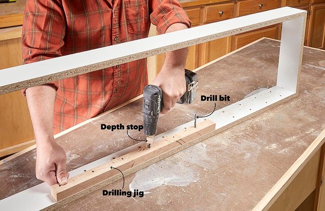 • Hold the jig in place on the cabinet side and drill the first hole.