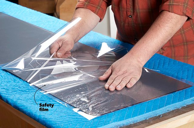 • This mirror will be in motion regularly, so I applied transparent window safety film ($15 for an 18-in. x 8-ft. roll online) on the back.