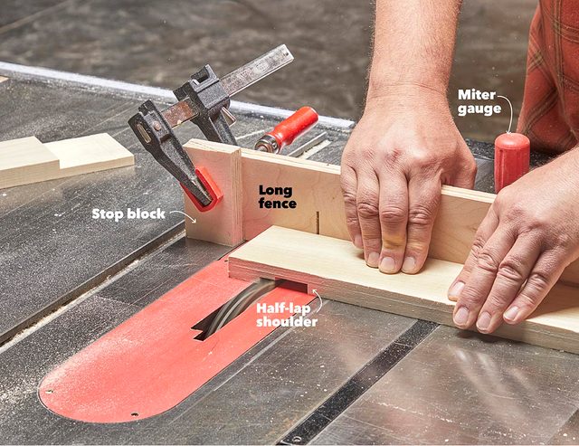 • Pro Tip: I cut half-laps using a dado set on my table saw. I attach a long fence to the miter gauge, and then add a stop block to set the joint’s shoulder. Start with two scrap pieces, making passes in both until you get the right depth.