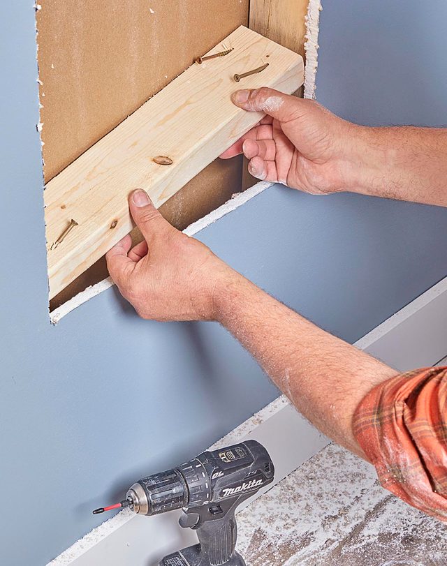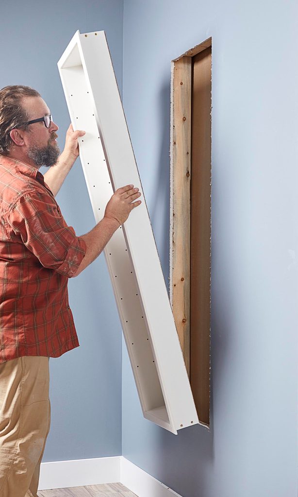• Set the cabinet in the opening, plumb and level. Fasten it into place with three-inch wood screws through the sides, into the studs.