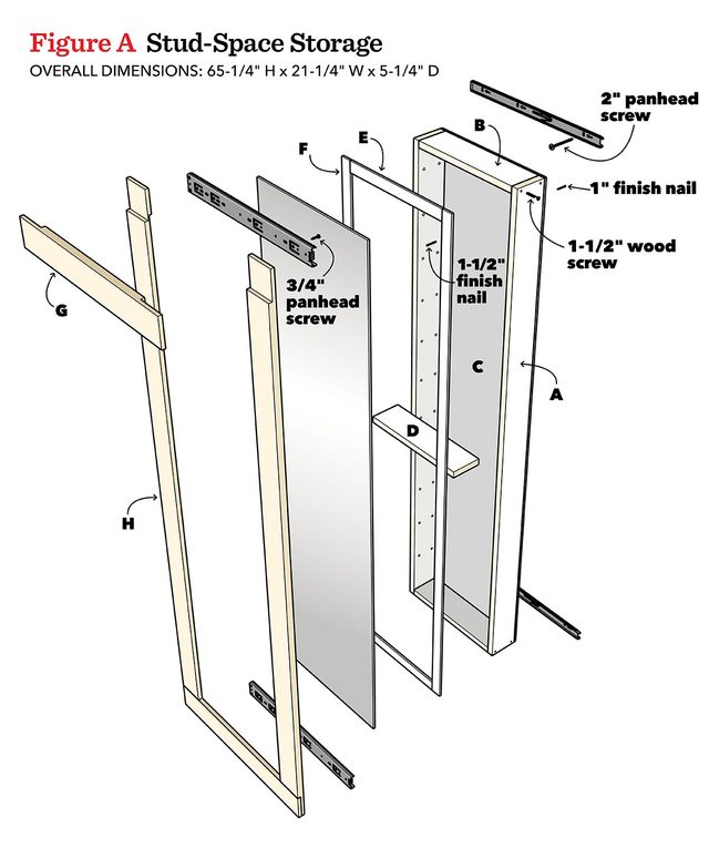Got plans to hang a mirror or a large painting? Consider using the stud cavity behind it for handy, secret storage. I installed this mirror cabinet in the bathroom — like a giant medicine cabinet. The mirror glides on ball-bearing drawer slides to open and close the cabinet. When the mirror is in place, nobody knows the cabinet is even there!