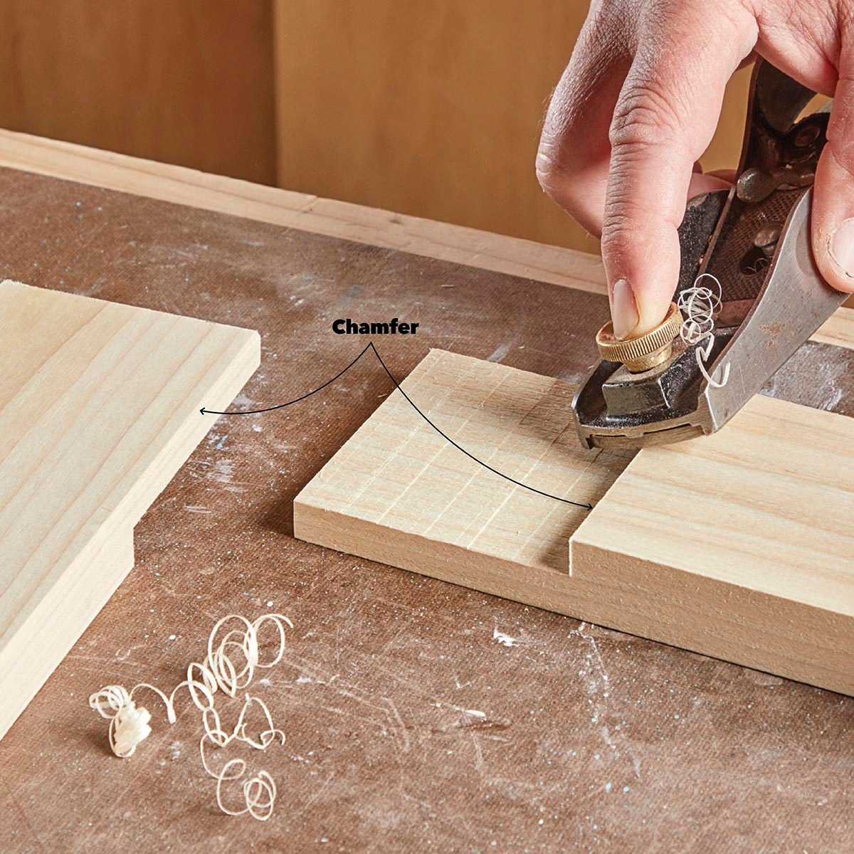 • Note: This creates a shallow “V” where the joints come together. The groove is optional but adds some visual interest. I like to use a block plane for this, but a sanding block works fine.