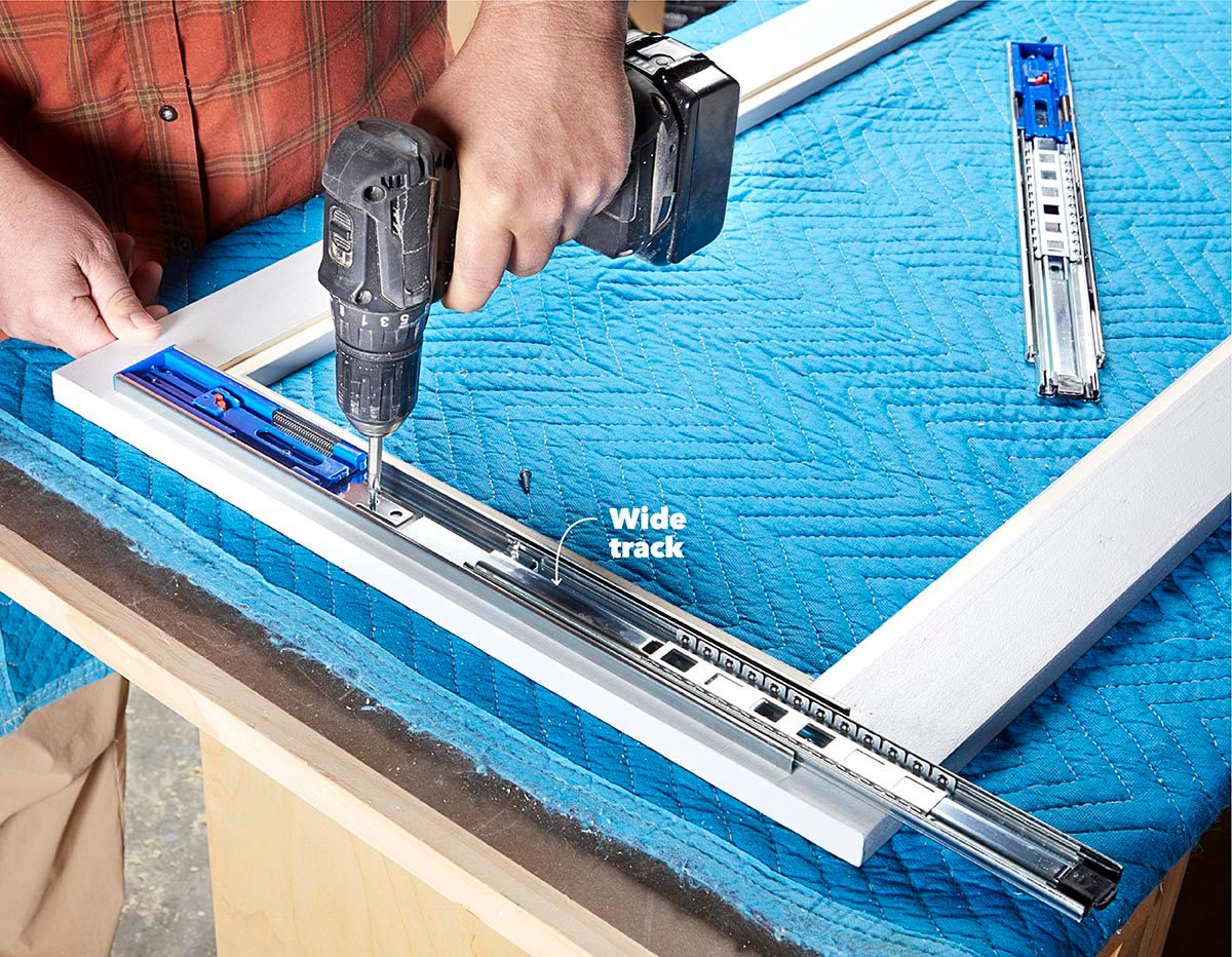 • Separate the two components of the drawer slides. Fasten the wide tracks to the frame.