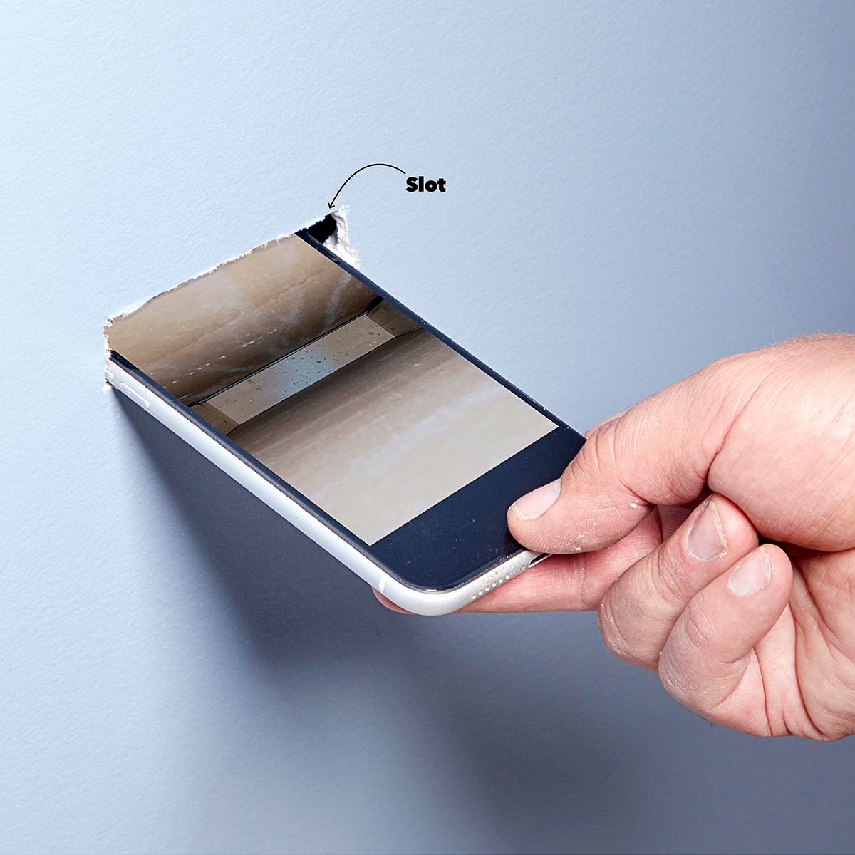 • Check for obstructions in the wall cavity. Cut a slot big enough for your phone, and take one photo up and one down.