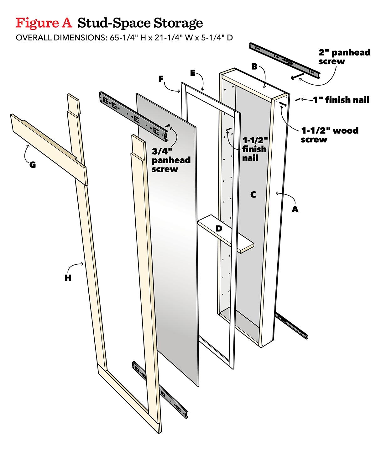 Got plans to hang a mirror or a large painting? Consider using the stud cavity behind it for handy, secret storage. I installed this mirror cabinet in the bathroom — like a giant medicine cabinet. The mirror glides on ball-bearing drawer slides to open and close the cabinet. When the mirror is in place, nobody knows the cabinet is even there!