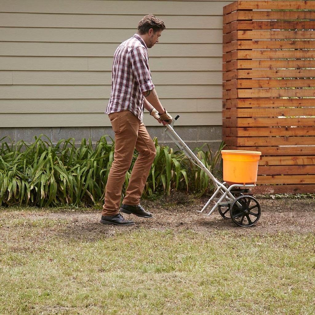 - If you have a large yard bordered by flower beds or vegetable gardens, use a drop spreader to spread the seed near them before doing the majority of the yard with a broadcast spreader. Since the seed drops straight down, you won’t be casting grass seed in your gardens by mistake. When using the drop spreader around border gardens, overlap subsequent passes slightly for more even seed distribution.