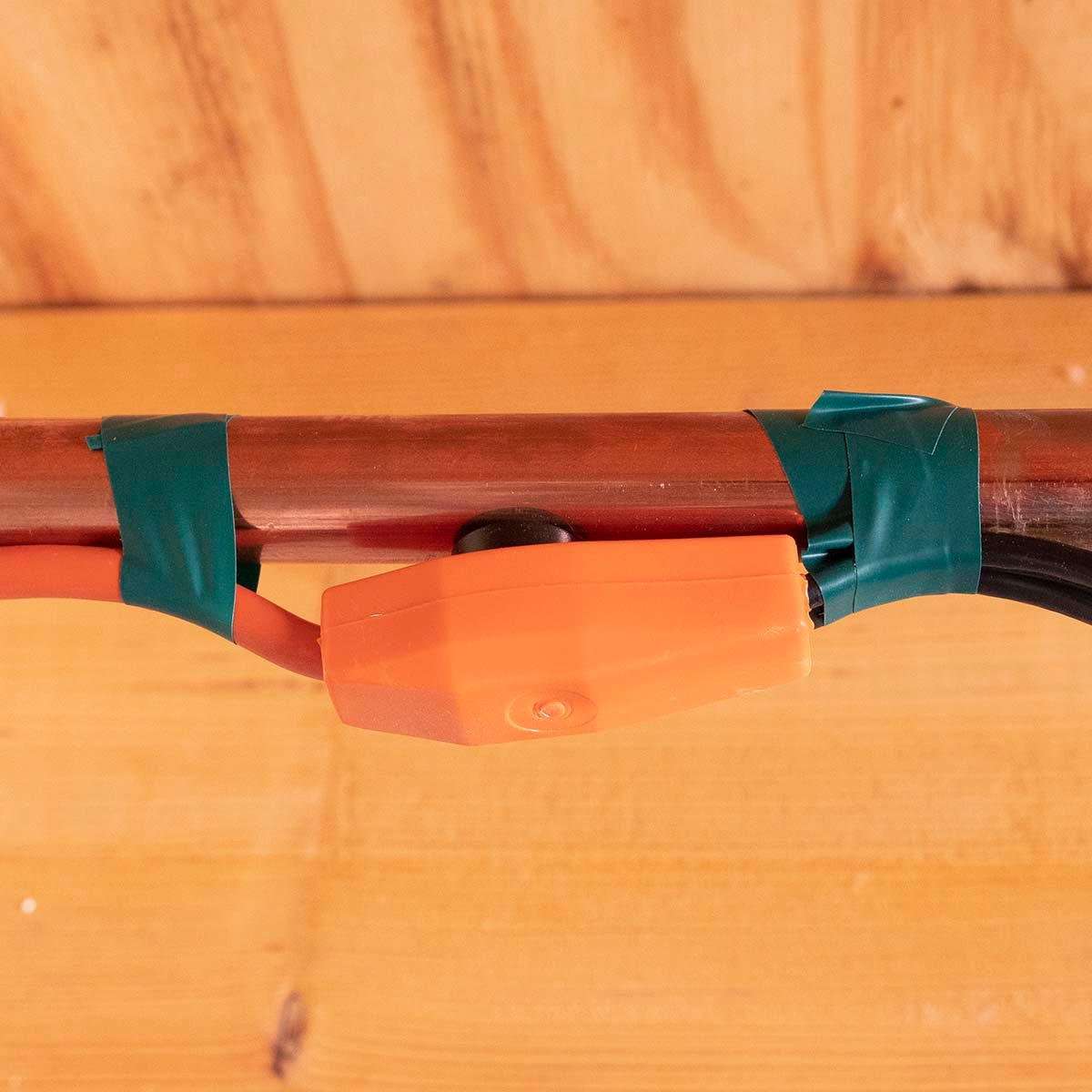 - Attach the heat tape to the frozen pipe using electrical tape. Do not wrap the heat tape around the pipe. Be sure the heat sensor makes direct contact with the pipe (see photo).