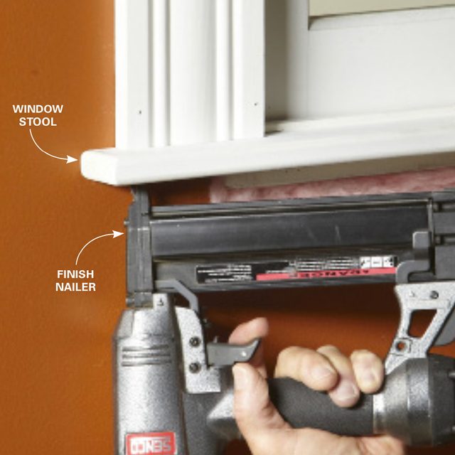 The order of trim installation for windows (and door trim as well) varies a little depending on whether you’re working on old double-hung windows or newer-style windows. On older double-hung windows, the stool rests on the angled sill and butts into the lower sash. You have to notch the new window stool to fit, and nail it to the windowsill before you install the side casings. But on newer windows like the one shown here, the stool isn’t notched and doesn’t rest on the sill, so it’s a little trickier to nail. An easy way to attach this type of stool is to install the side casings first, and then nail the stool to them.
