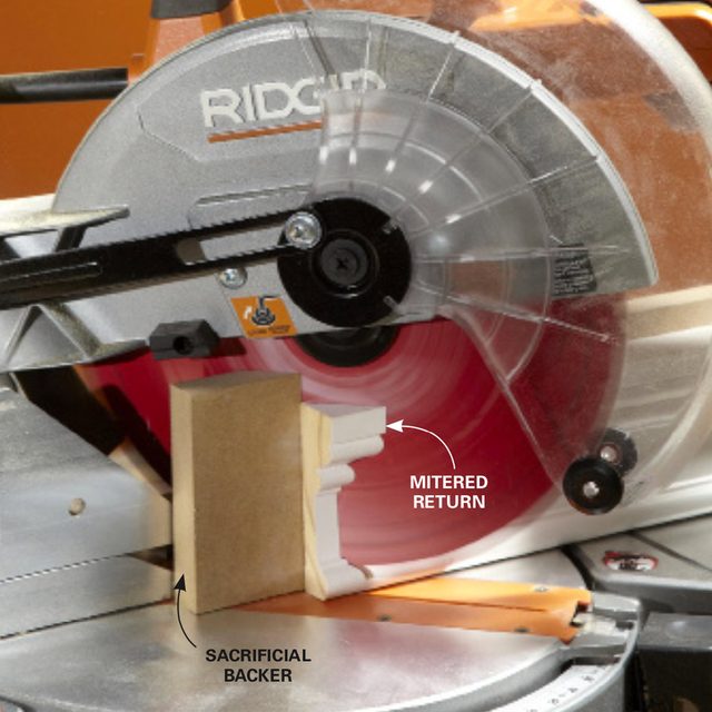Photo 3 shows how I used a sacrificial piece of wood behind the apron material. Any flat scrap of wood will work. This sacrificial backer board prevents the skinny piece of molding you’re cutting off from getting caught by the blade and flung through the gap in the fence. Don’t attach the sacrificial board to the saw. Just hold it in place along with the molding you’re cutting. Then reposition it with each new cut so you’re always making a fresh cut through the sacrificial board.