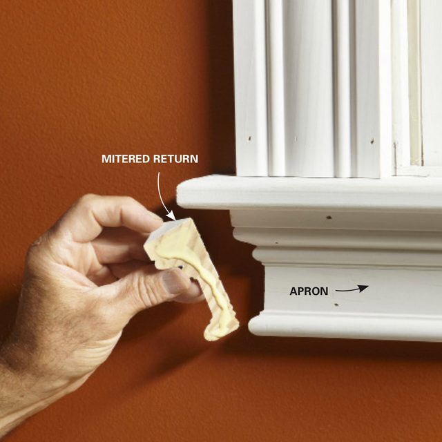 With the side casings and stool in place, the next step is to install the apron under the stool. Start by cutting a 45-degree miter on each end. Mark for the long point of the miters by resting the apron on the stool and making marks where the outside edges of the casings intersect the apron material. Snug the mitered apron against the bottom of the stool and nail it to the framing under the window. Then cut returns and glue them in.