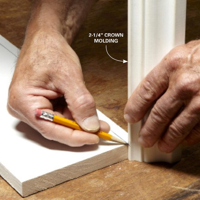 Hold a piece of crown molding against the 1×6 you’ll be using for the head casing and mark it for cutting. The final step for both the door and the window trim is building and installing the head casing assembly. It’s made up of three parts: the fillet, a 1×6 and the cap molding. Traditionally this cap molding was solid, but since a solid molding this large is hard to come by, we substituted 2-1/4-in. crown molding. If you have a router and want to avoid using crown molding, check out Figure B above for an attractive alternative.