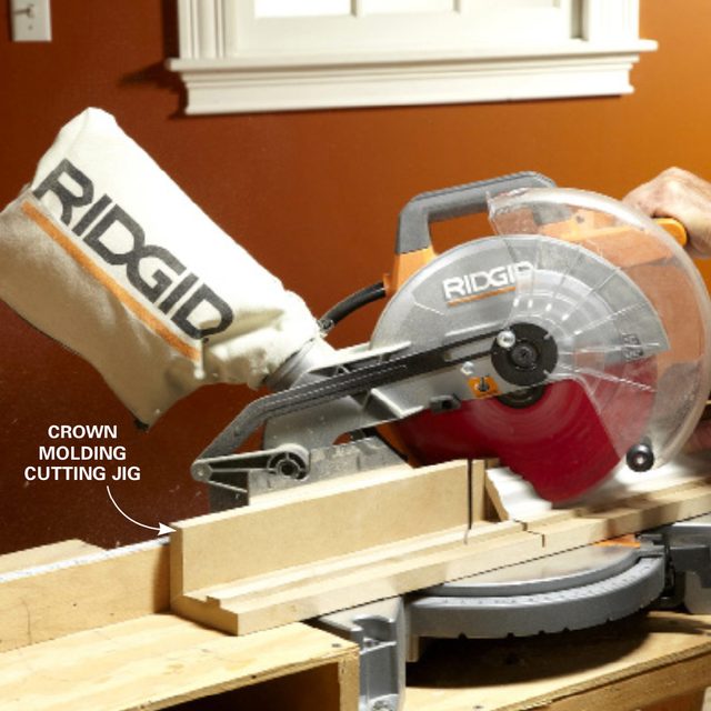 Build a simple jig to hold the crown molding at the correct angle while you cut it. Position the molding upside down and set the saw to 45 degrees. Avoid cutting all the way through the jig.