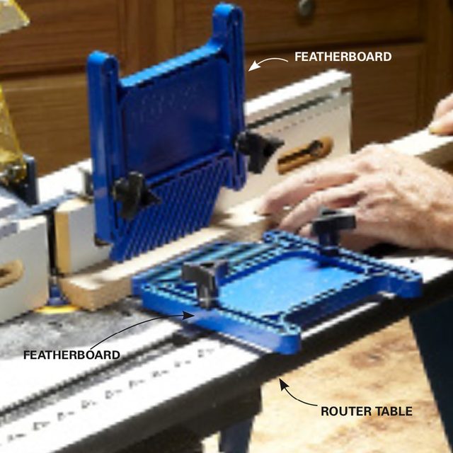 The photo shows how to use featherboards for safer and more accurate routing. You can make your own featherboards, or buy plastic ones like the ones in the photo for about $10 to $20 each.