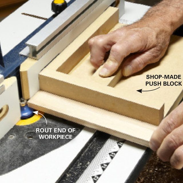 The ends of the boards shown in Figure B are routed. This method eliminates the need for mitered returns, but it does expose end grain and means you have to cut the parts to length before you shape them. To rout the end of boards, use a shop-made push block like the one shown here. It serves two functions. First, it allows you to hold the board square to the fence. And second, the push block prevents splintering by providing a backer behind the board you’re routing.