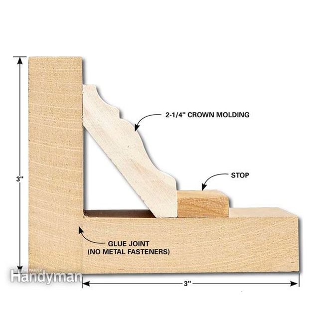 This jig holds the crown molding at the correct angle in the miter saw, so it’s easy to make accurate miters every time. Glue two strips of scrap wood together at a right angle. Then set the crown molding upside down in the jig and mark the position of the stop. Glue the stop to the bottom and you’re ready to cut some moldings.