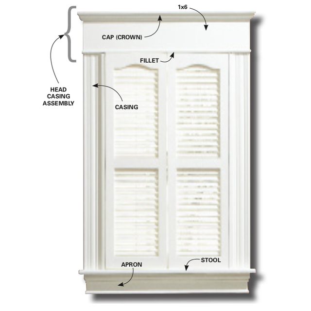 Nail the crown molding to the 1×6. Then glue and nail in the end returns. Nail the fillet to the bottom of the 1×6 to complete the head or and window casing assembly. Start by setting the 1×6 on top of the side casings and marking it at the outside edge of each casing. Cut the 1×6 to length. Then cut the fillet 3/4 in. longer than the 1×6. Round over the edges and ends of the fillet to make a bullnose shape using a router and 1/4- in. round-over bit. Nail the fillet to the bottom of the 1×6.