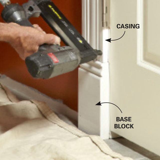 Trimming a door is just like trimming a window, except you start out with base blocks at the floor, as shown here. The base blocks should be about 3/8 in. wider than the casings. Door and window trim them if necessary. The height of the base blocks should be about 1 in. greater than the height of the baseboard you’re planning to install. Check out this hack for installing a door on an uneven floor.