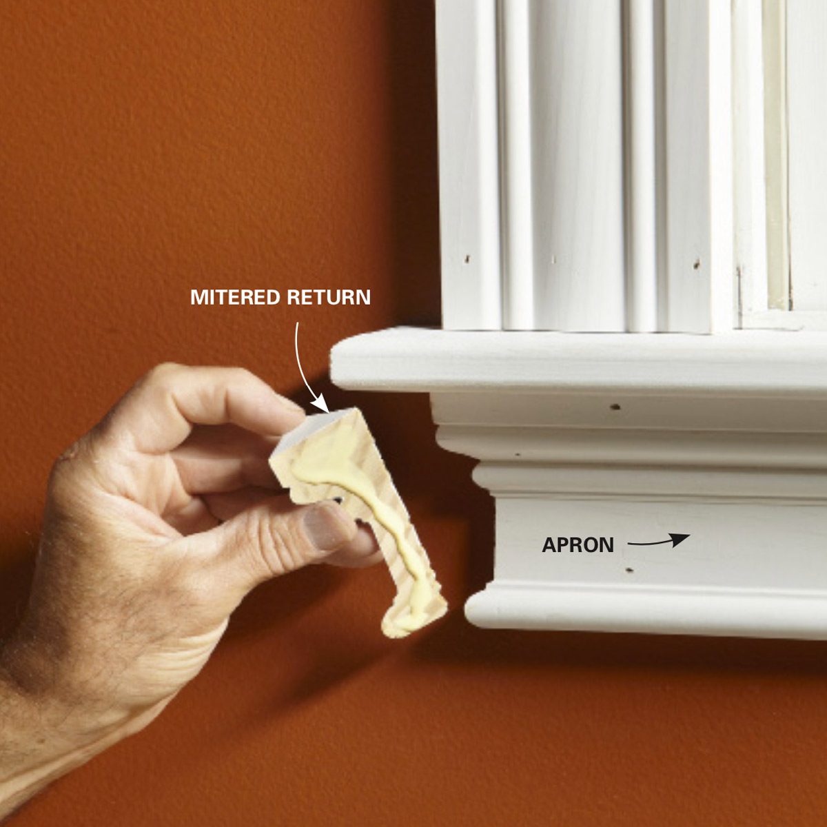 Glue in the returns to complete the apron. Avoid nailing problems by letting the glue do the work. Just hold the return in place for 60 seconds while the glue grabs.