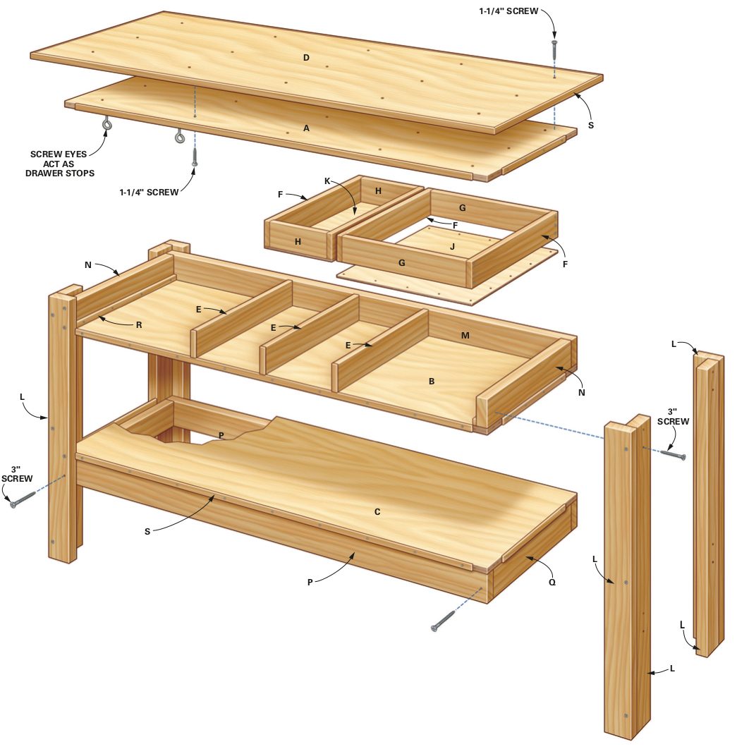 Use this simple workbench plan to build a sturdy, tough workbench that'll last for decades. It has drawers and shelves for tool storage. It's inexpensive. And even a novice can build it in one day.