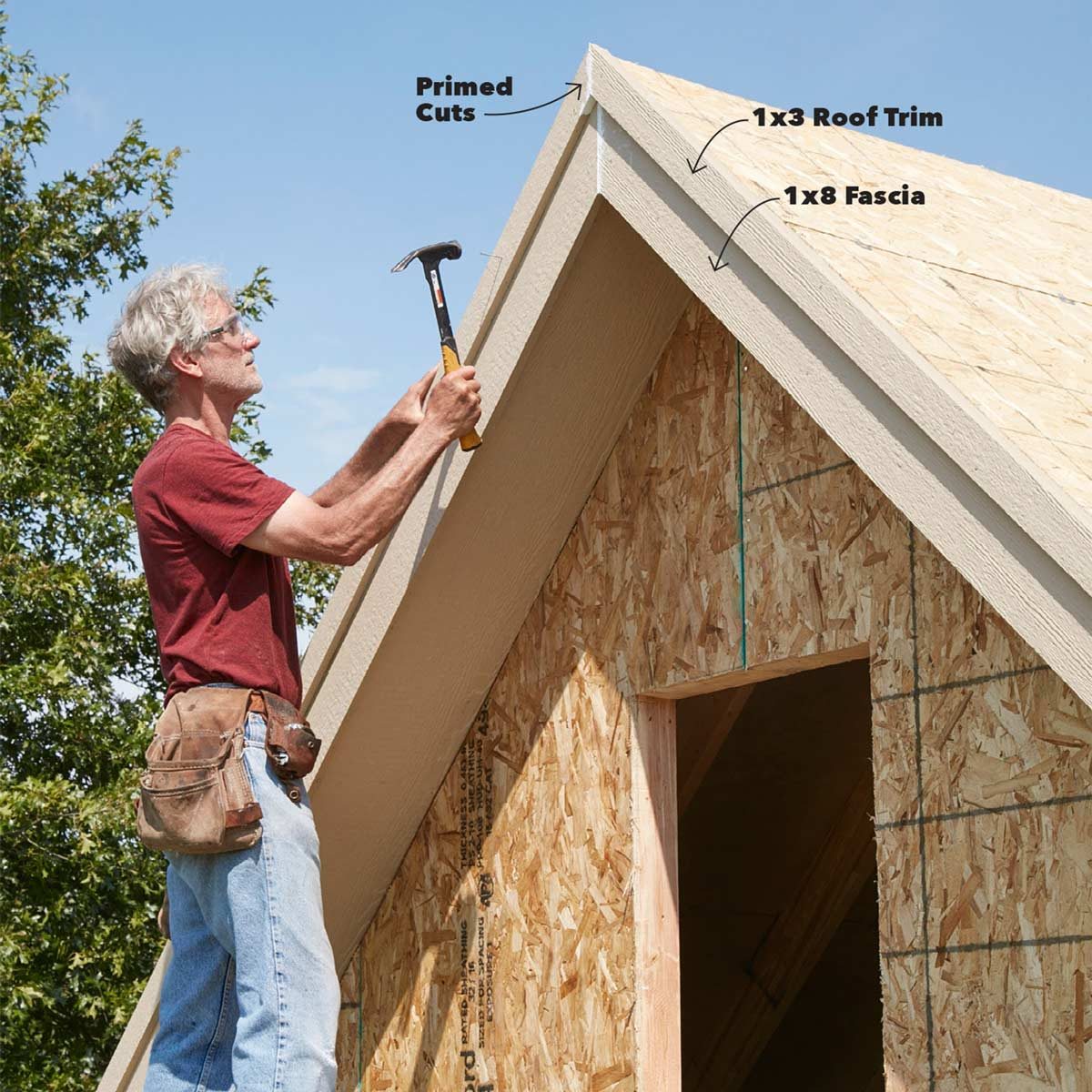 Start by nailing the soffit boards to the underside of the rafters. Then add the 1×8 fascia boards that cover the 2×6 subfascias and overhanging rafters. Finish the overhang trim by installing the 1×3 roof molding over the 1×8 fascias (photo above).