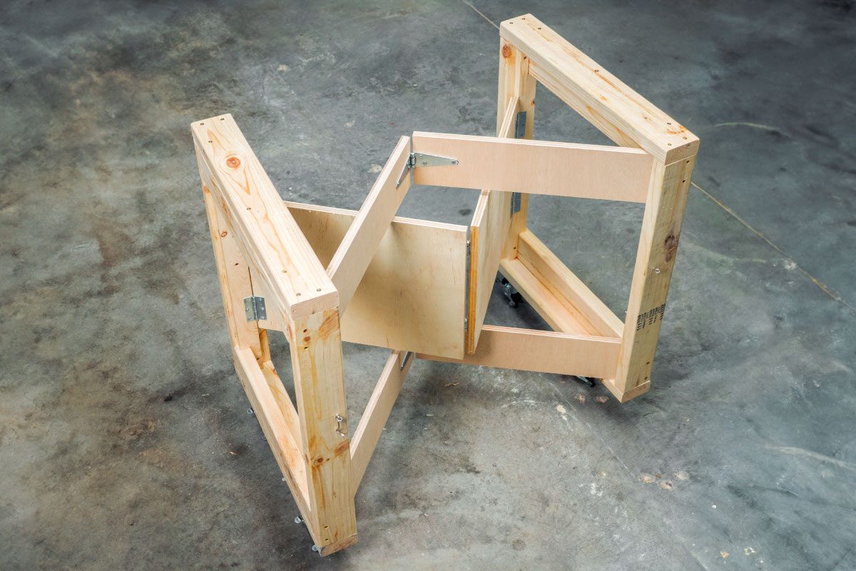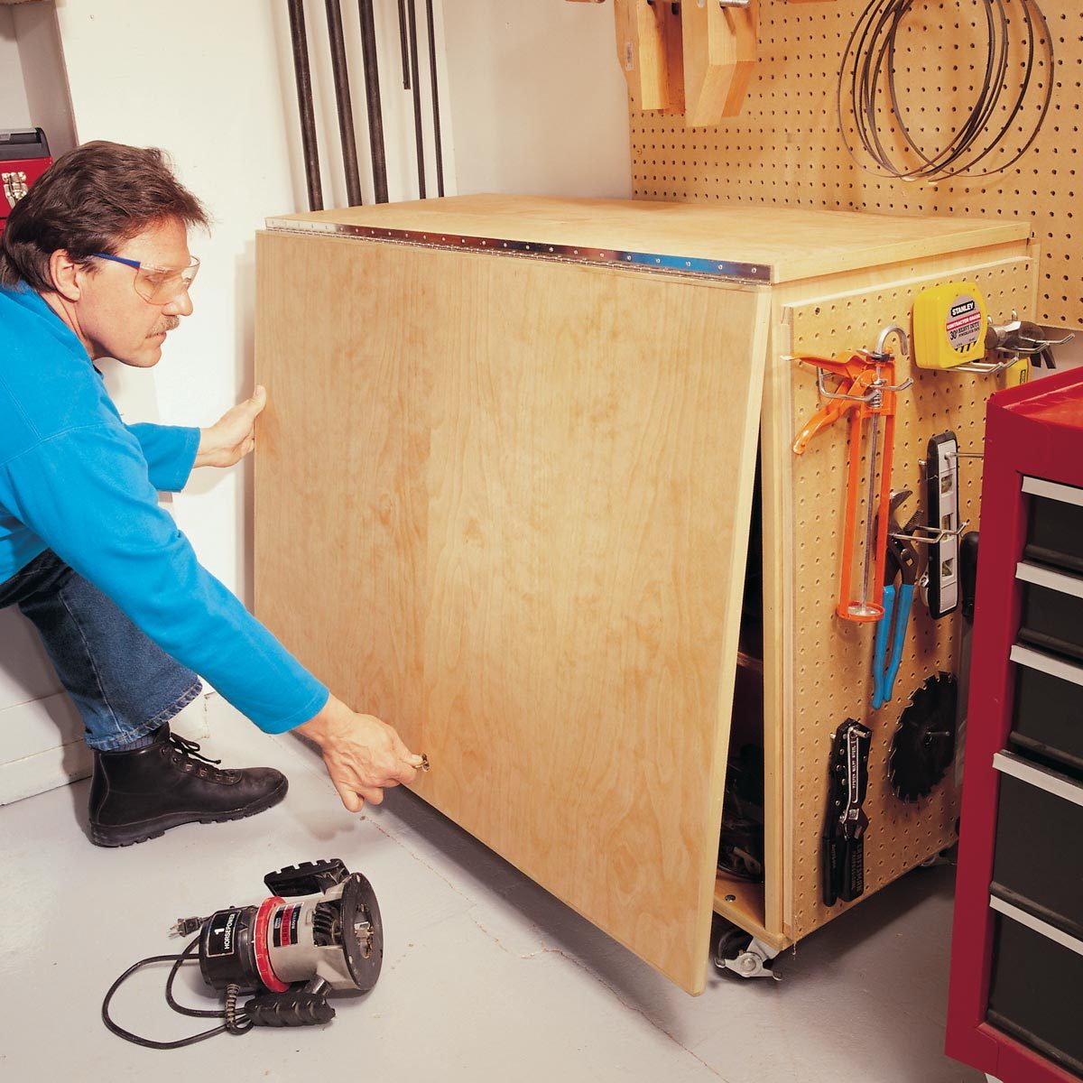 Build this handy mobile workbench that folds up to only 7 in. You only need two hours, some 2x4s, 3/4-in....